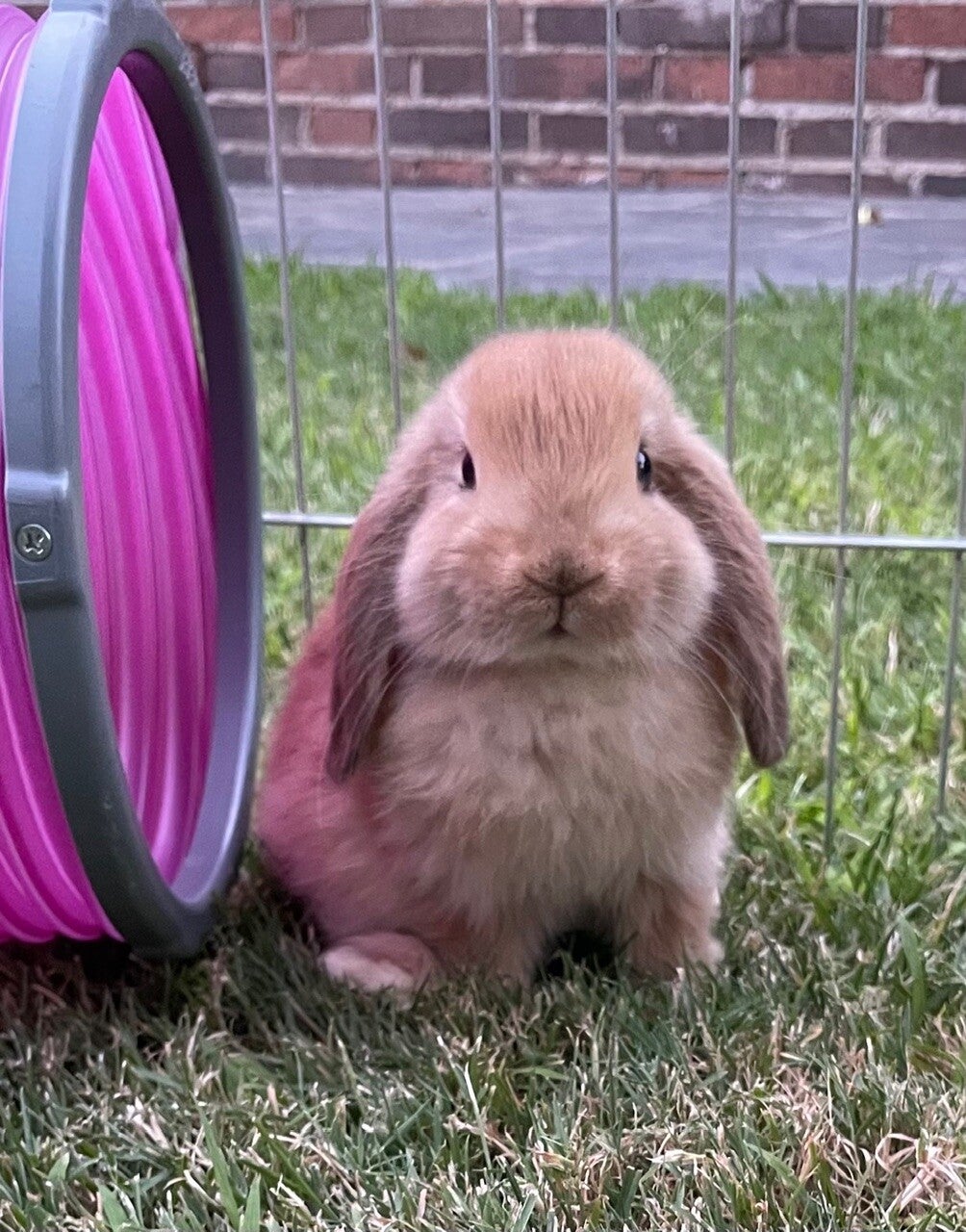 Je m’appelle Fluffy et j’habite chez Alejandra. Je suis un lapin aux oreilles tombantes, donc je suis un lapin bélier français.