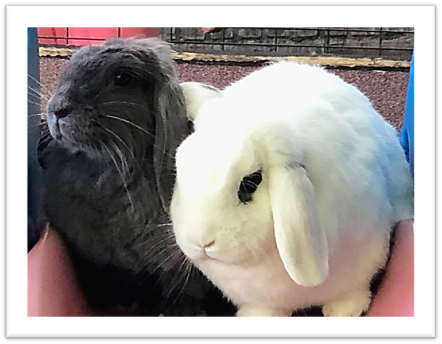 Bunny est le lapin blanc avec les yeux noires (à droite) sur la photo, et Hasi est le lapin gris avec la crinière (à gauche).