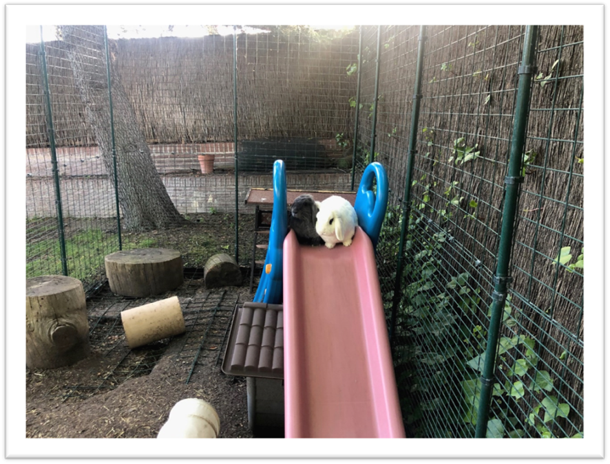 Dans l’enclos, nous avons beaucoup de place et nous sommes protégés des autres animaux, comme les oiseaux de proie et les chats.